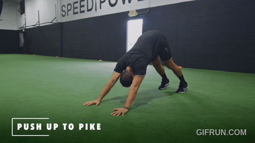 Perform a push-up, then push hips up and head through the arms to pike to overhead.