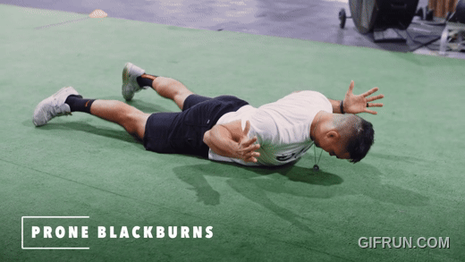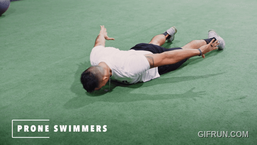 Lie face down and press straight out overhead, lifting the arms as high off the floor through the full range of motion, focusing and squeezing the shoulder blades back.