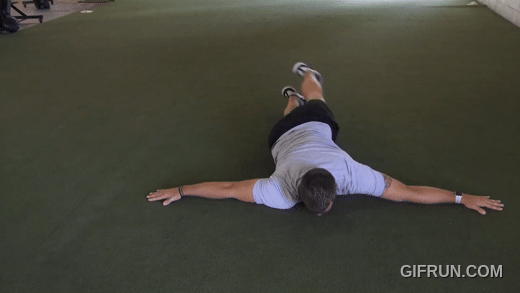 Lie face down with arms out. Reach one foot across your body toward the opposite hand. Rotate through the hips while keeping control.