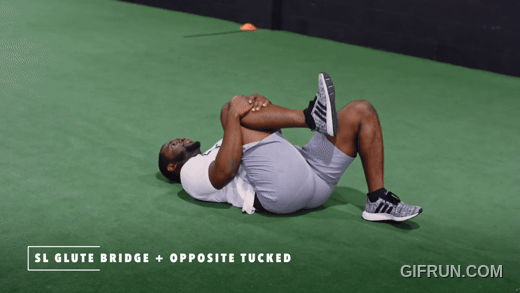 Lie on your back. Pull one knee tight to the chest while the opposite foot stays planted. Drive through the planted foot and perform a single-leg glute bridge.