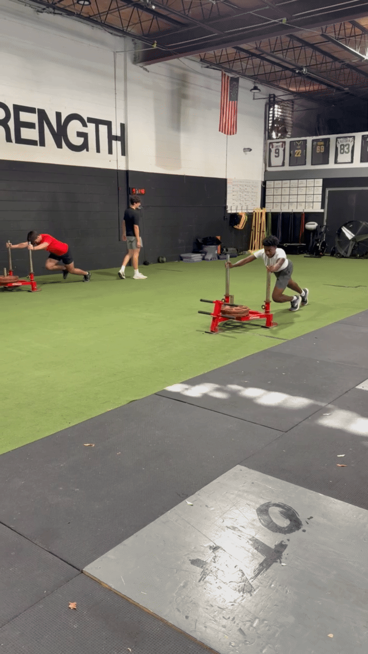 Heavy sled marches develop force production, core stability, and leg drive and triple extension—critical for accelerating quickly off the line and producing more horizontal force.
